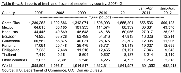 Table 6—U.S. Imports of fresh and frozen pineapples, by country. 2007-2012