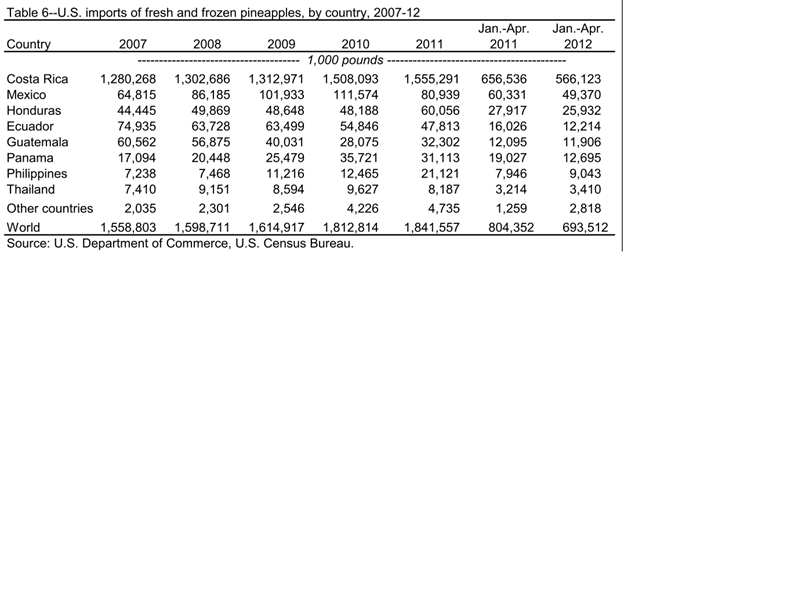Table 6—U.S. Imports of fresh and frozen pineapples, by country. 2007-2012